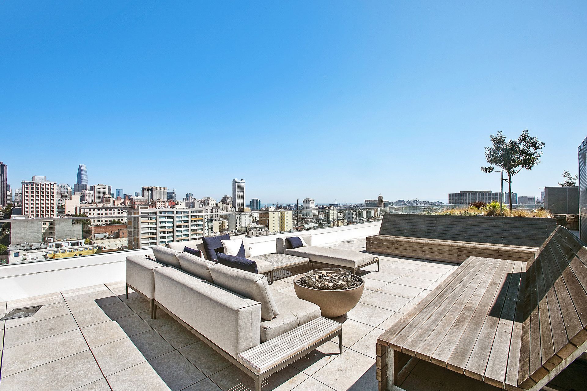 - a giant shared roof top deck with panoramic views, BBQ, fire pit and plenty of lounge seating