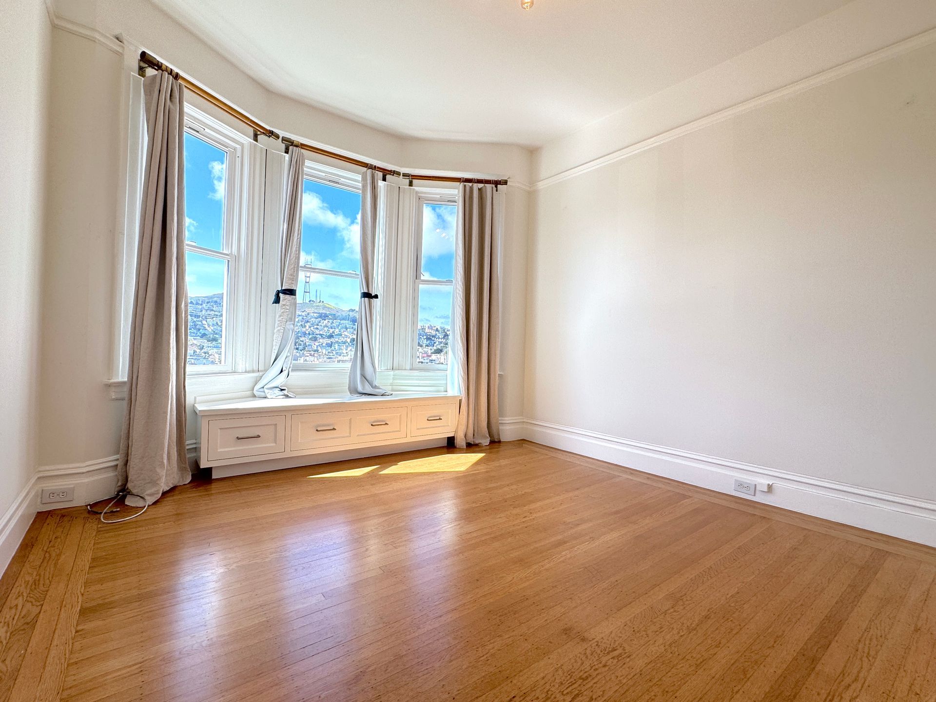 Abundant natural light from every side floods this full top floor 3-Br 2-Ba Noe Valley luxury condo with private 2-car garage (will fit 2 small cars or one regular size), EV charging connection, and sweeping views of downtown and western hills. Dramatic curved stairway entry, living room with gas fireplace and built-in bookcases and front bedroom/office bay windows overlook Dolores palm trees, downtown and the bay. Pocket doors open to formal dining room with recessed-lit custom cabinetry. Open galley kitchen with south-facing windows features Samsung refrigerator and dishwasher, commercial gas range, stone counters, custom Kraft Mold soft close cabinetry, deep undermount sink, wet bar/wine refrigerator and laundry closet. Two rear bedrooms overlook Noe Valley and Twin Peaks. Fully remodeled marble bathroom with deep tub, second bathroom with stall shower, windowed hall closet, custom closets and bench seating, hardwood floors throughout, all a short walk to 24th Street, Dolores Park and easy freeway access to the Peninsula!