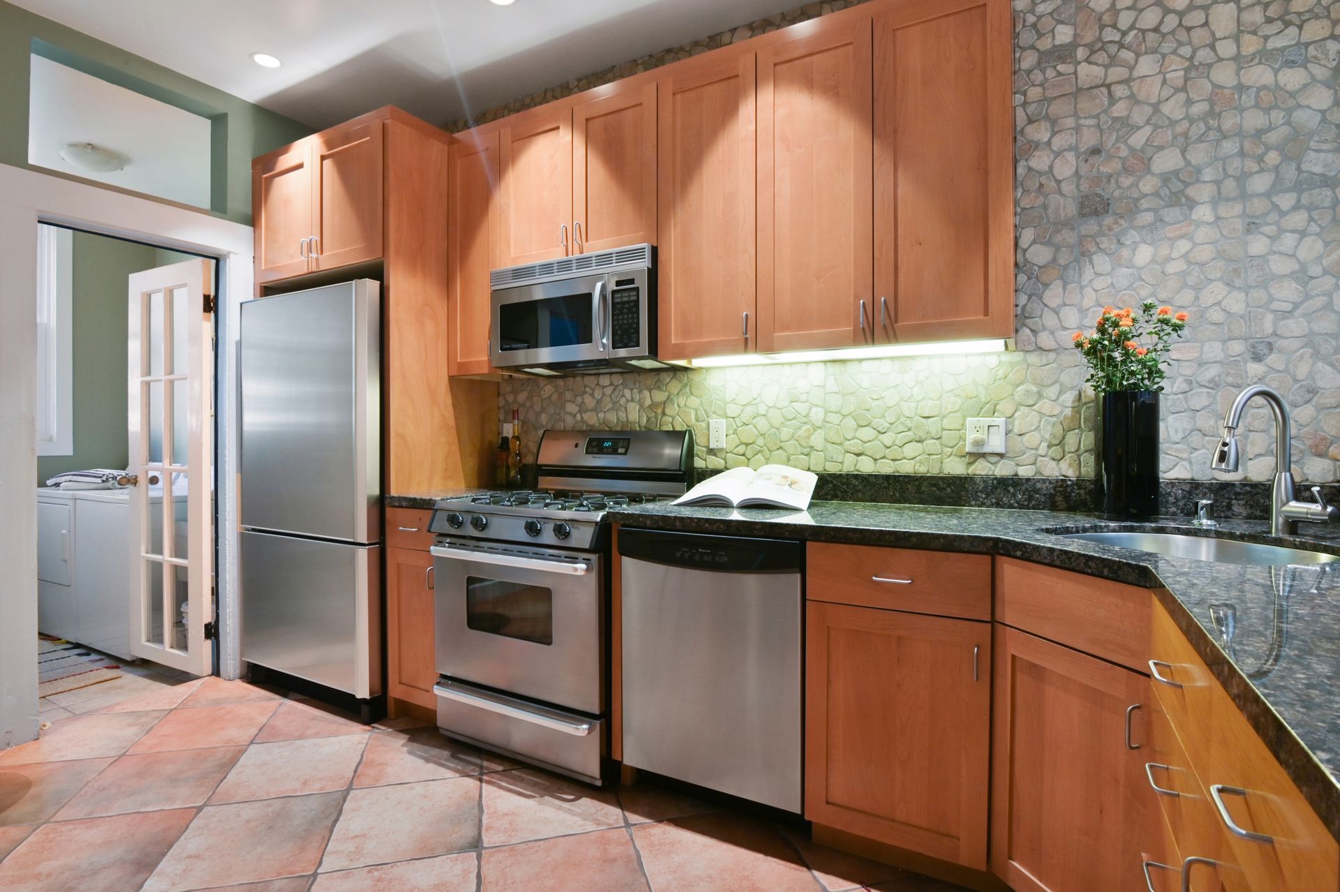 - remodeled eat-in kitchen with stainless steel appliances, including a gas range and dishwasher