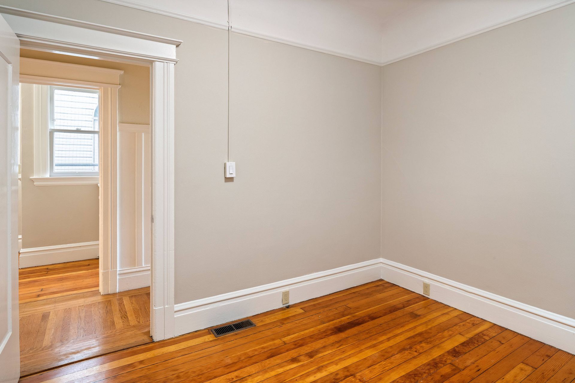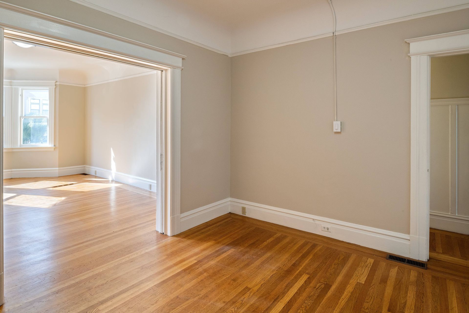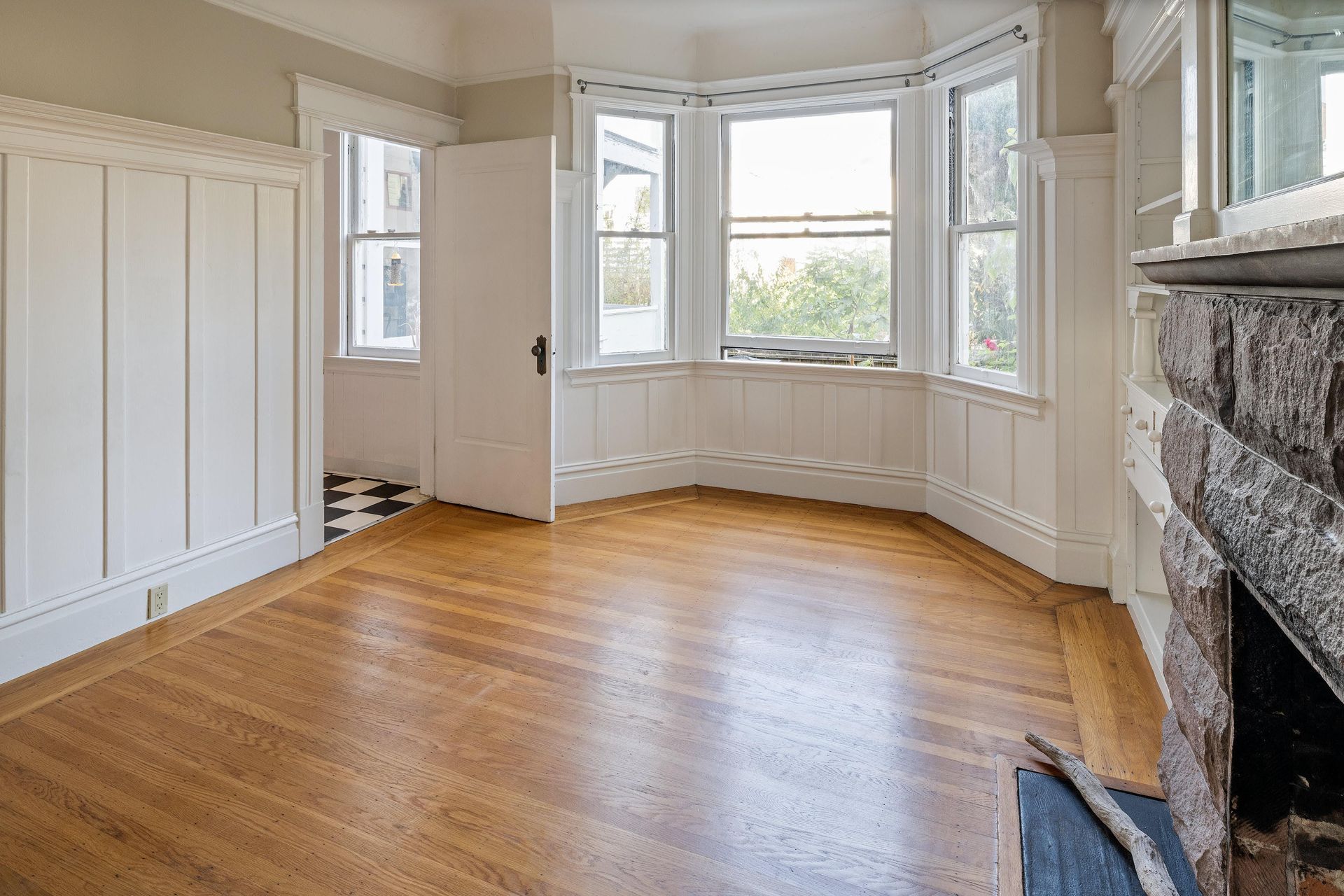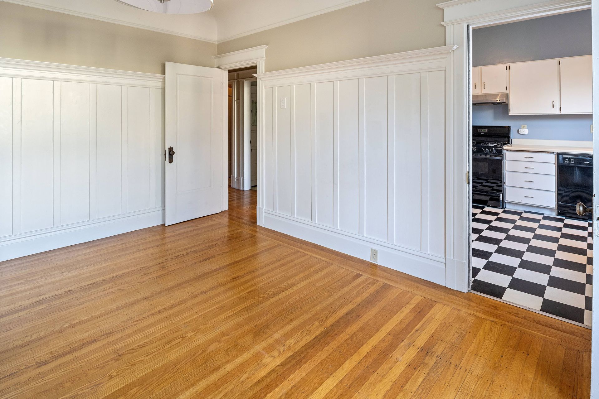 Hardwood floors throughout with tiles in the kitchen.