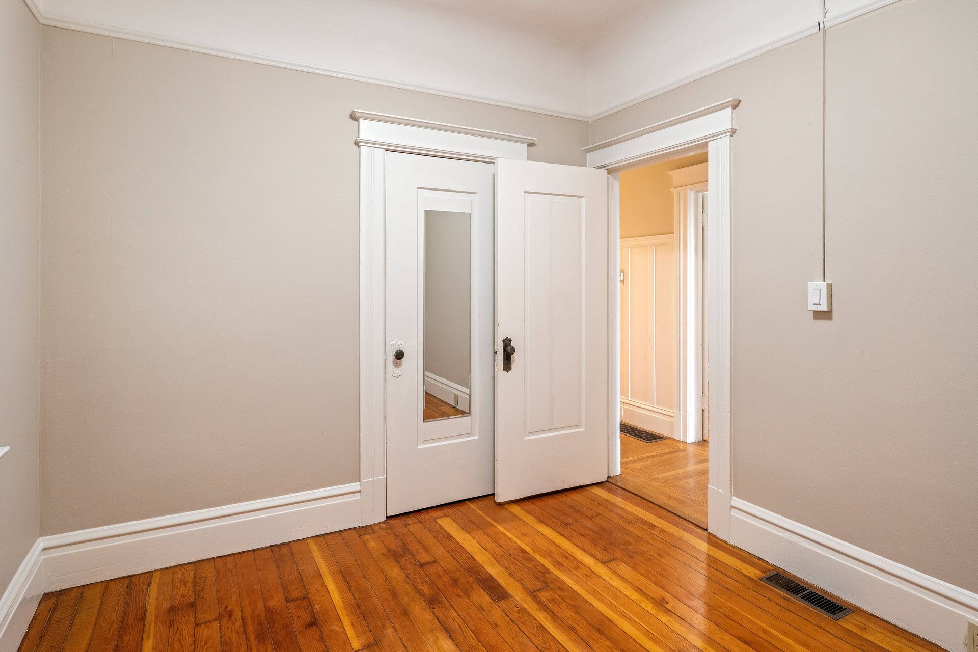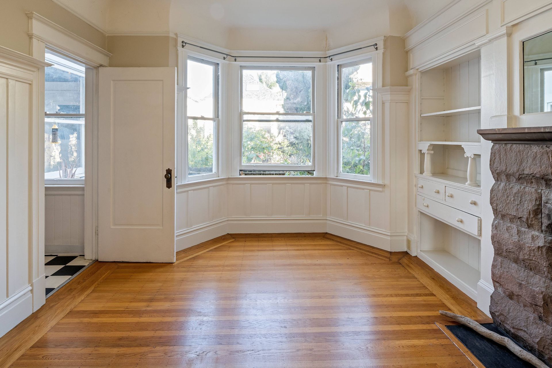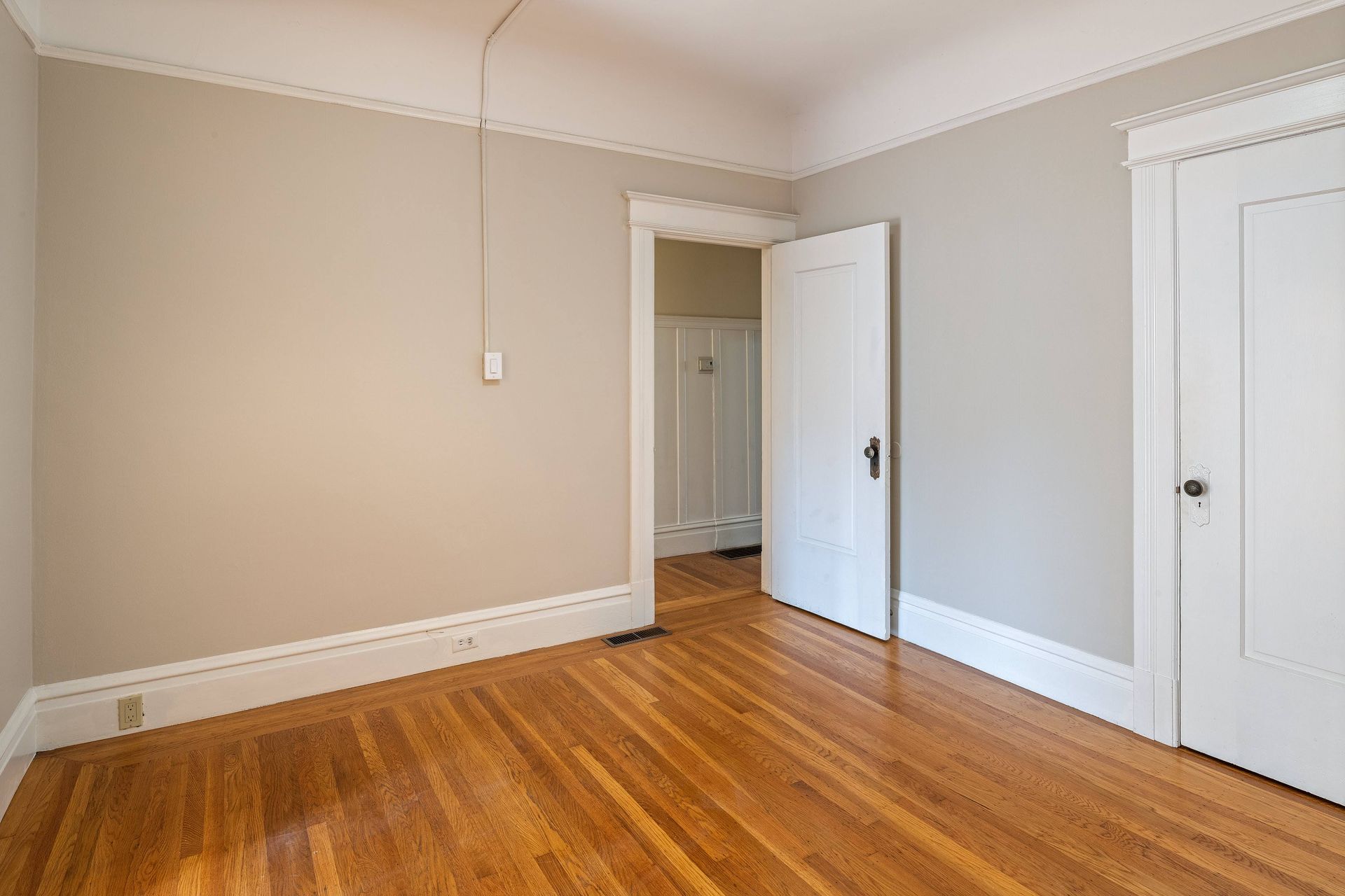 Hardwood floors throughout with tiles in the kitchen.