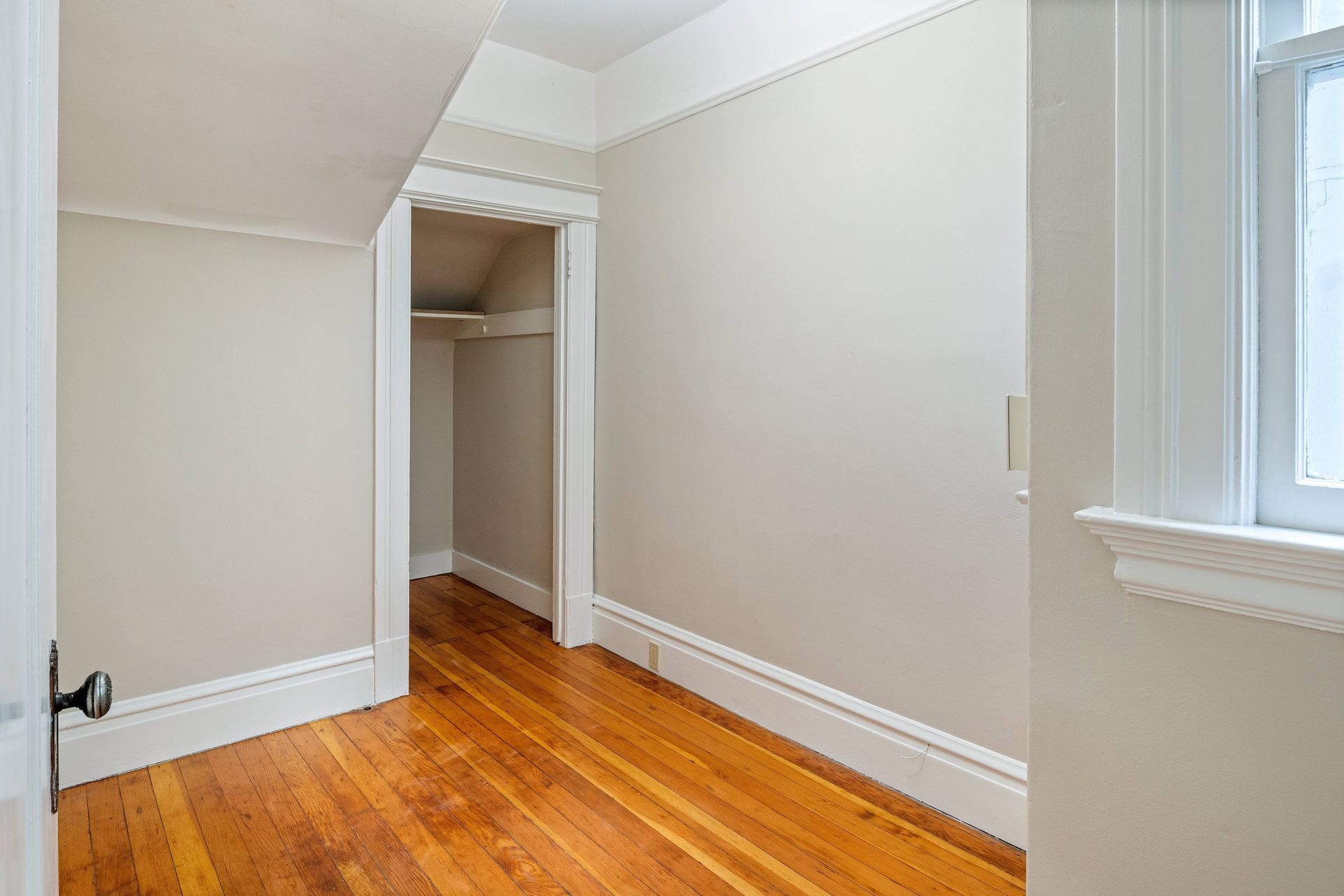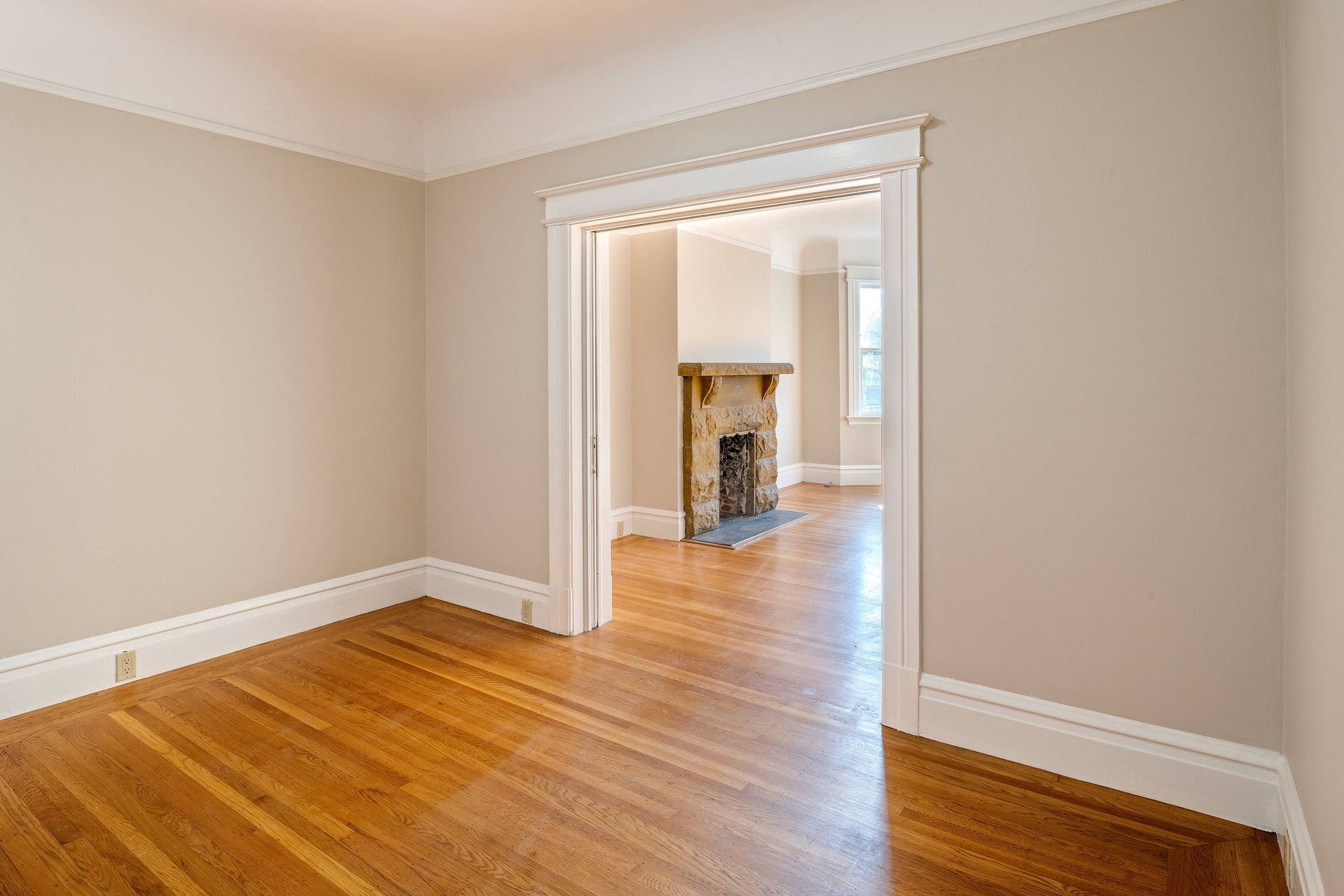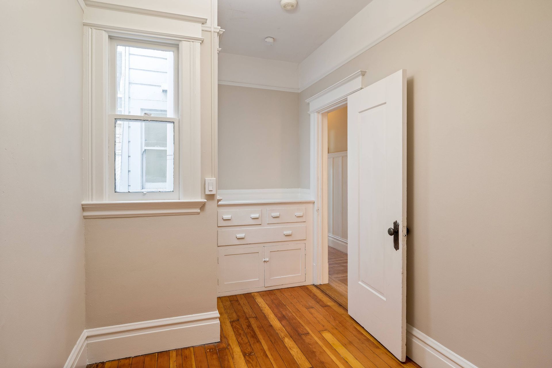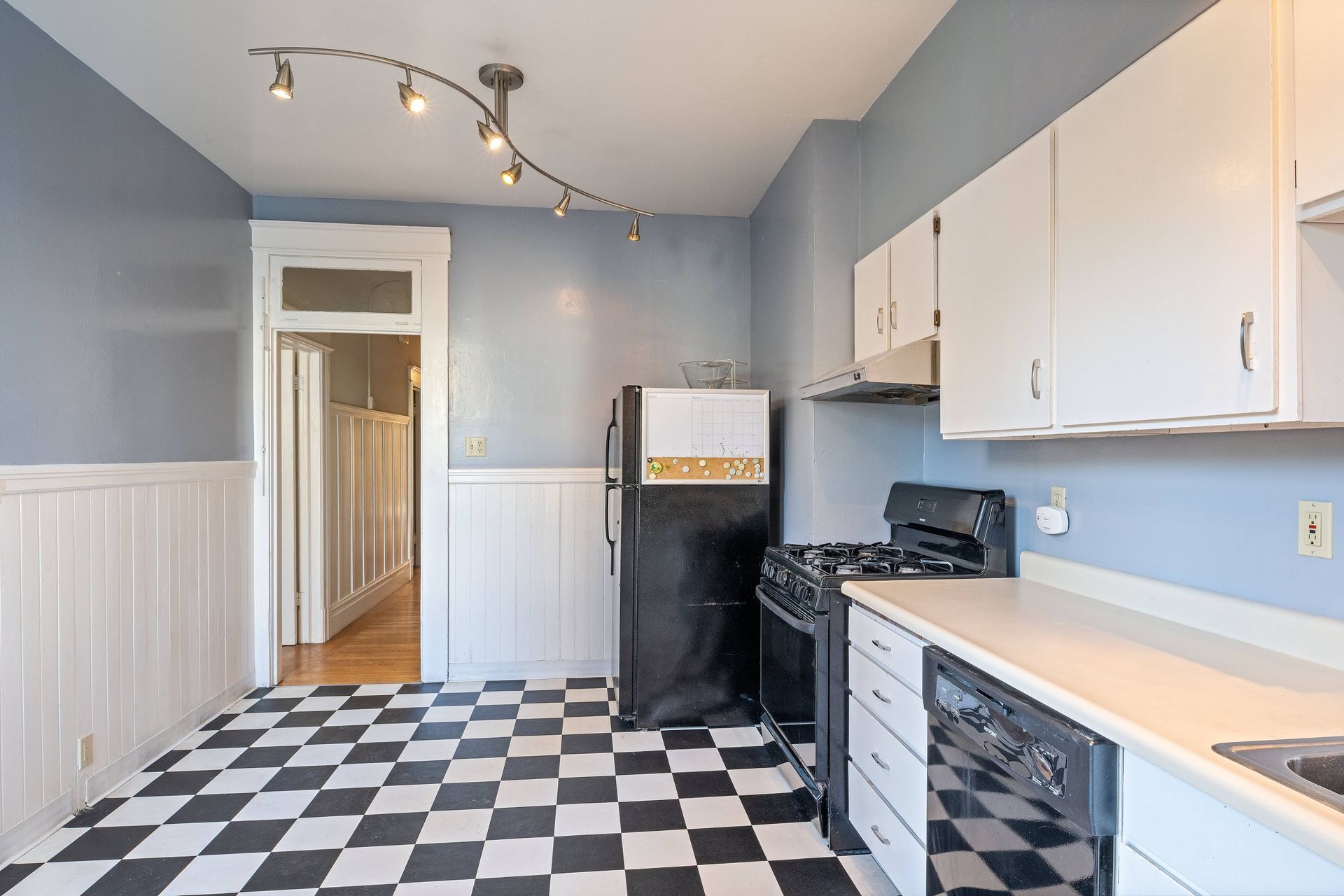 Hardwood floors throughout with tiles in the kitchen.